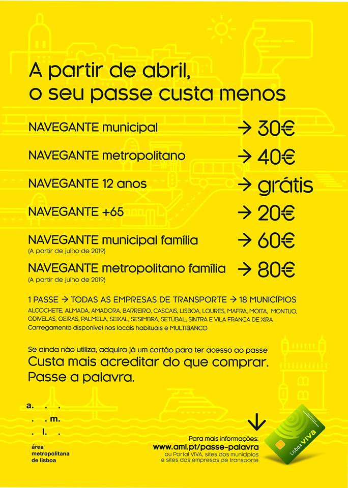 A partir de 1 de abril entra em funcionamento um simplificado sistema tarifário que traduz uma redução significativa do custo para os utentes dos transportes públicos de passageiros na Área Metropolitana de Lisboa (AML). O passe único passa a ter duas configurações: o Navegante Metropolitano custará 40 euros, permitindo deslocações em todos os 18 municípios da AML; o Navegante Municipal custará 30 euros, permitindo viagens dentro do Concelho. A contribuição do Município de Mafra para este novo sistema é de 1,5 milhões de euros por ano.