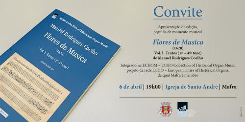 Será apresentada, no próximo dia 6 de abril, às 19h00, na Igreja de Santo André, em Mafra, a nova edição do livro “Flores de Musica” de Manuel Rodrigues Coelho, obra fundamental na aprendizagem de instrumentos de tecla, sendo interpretadas algumas peças pelos organistas André Ferreira, João Vaz e Sérgio Silva. A publicação realiza-se no âmbito da ECHOM - ECHO Collection of Historical Organ Music (cujo editor geral é Jean Ferrard), um projeto da ECHO (European Cities of Historical Organs), uma associação de cidades europeias com órgãos históricos, de que Mafra faz parte, desde 2014. A entrada é gratuita.