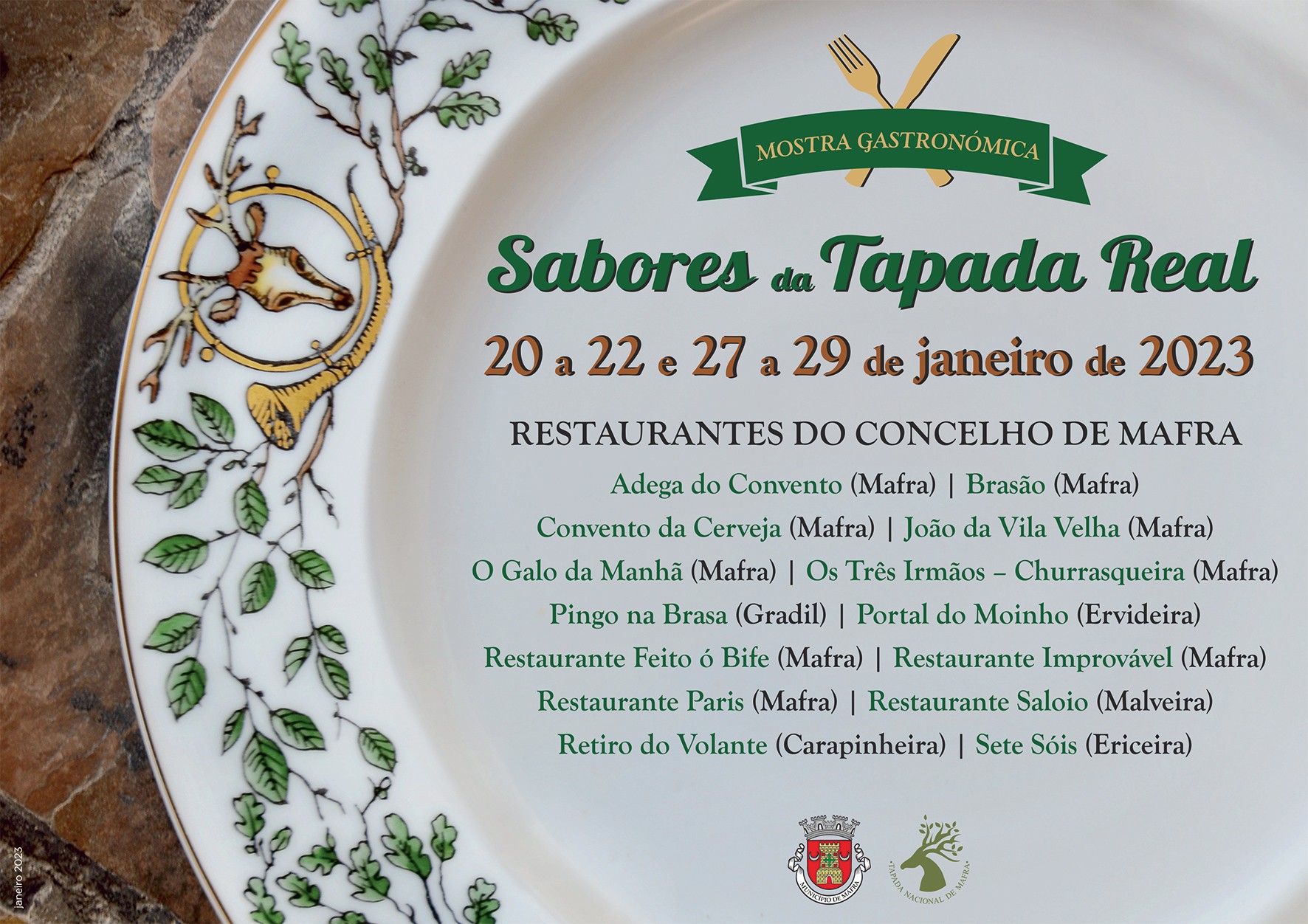 A Câmara Municipal e a Tapada Nacional de Mafra promovem a mostra gastronómica "Sabores da Tapada Real", que decorre de 20 a 22 e de 27 a 29 de janeiro, em 14 restaurantes do Concelho de Mafra, com propostas de pratos de caça.
