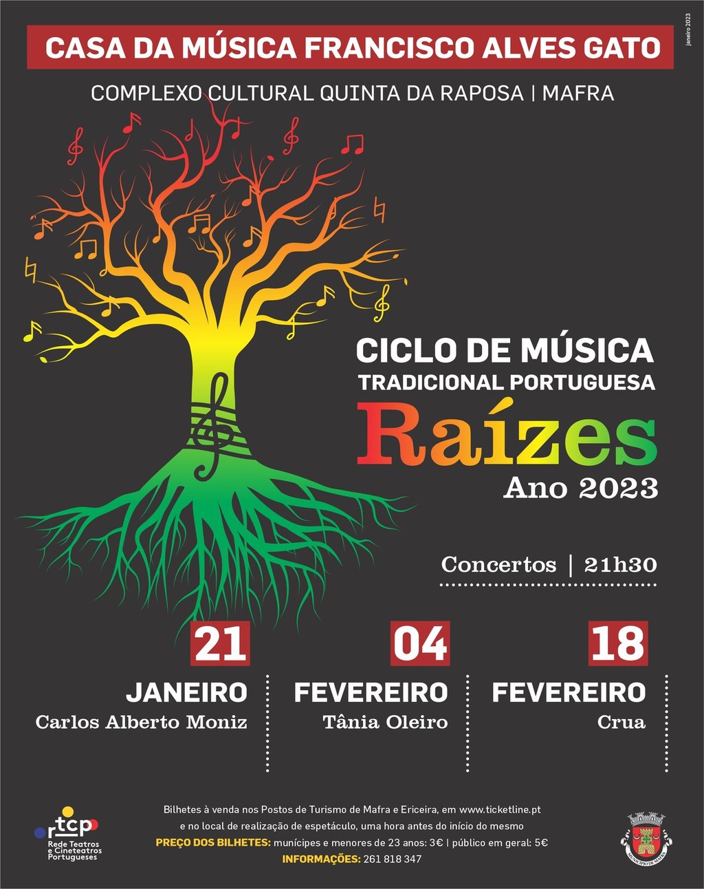 De 21 de janeiro a 18 de fevereiro, pelas 21h30, realiza-se mais uma edição do Ciclo de Música Tradicional Portuguesa “Raízes”, com três concertos agendados para a Casa da Música Francisco Alves Gato, em Mafra. O primeiro espetáculo, no dia 21 de janeiro, tem como protagonista Carlos Alberto Moniz. A 4 de fevereiro, sobe ao palco Tânia Oleiro. A encerrar o Ciclo de Música estará o grupo Crua, no dia 18 de fevereiro.
