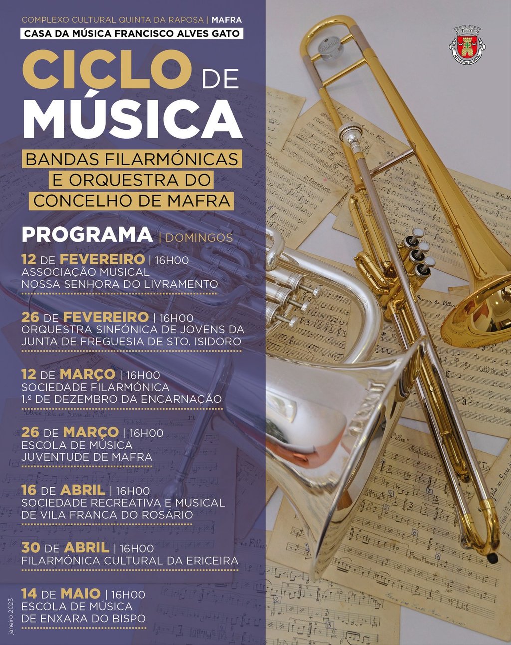 De 12 de fevereiro a 14 de maio, a música filarmónica está de regresso à Casa da Música Francisco Alves Gato, em Mafra, para mais uma edição do Ciclo de Música “Bandas Filarmónicas e Orquestra do Concelho de Mafra”.