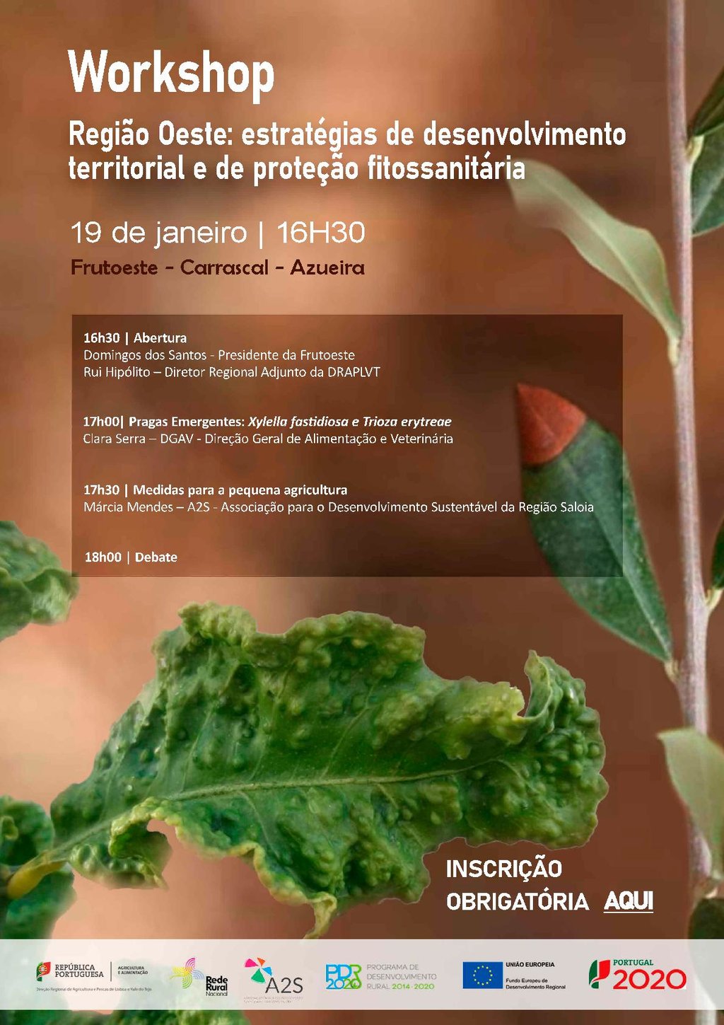 A Direção Regional de Agricultura e Pescas de Lisboa e Vale do Tejo (DRAPLVT), em colaboração com a Rede Rural Nacional e a A2S – Associação para o Desenvolvimento Sustentável da Região Saloia, promovem o workshop “Região Oeste: estratégias de desenvolvimento territorial e de proteção fitossanitária”, a realizar-se no dia 19 de janeiro, às 16h30, nas instalações da empresa Frutoeste, sita na localidade do Carrascal (Azueira).
