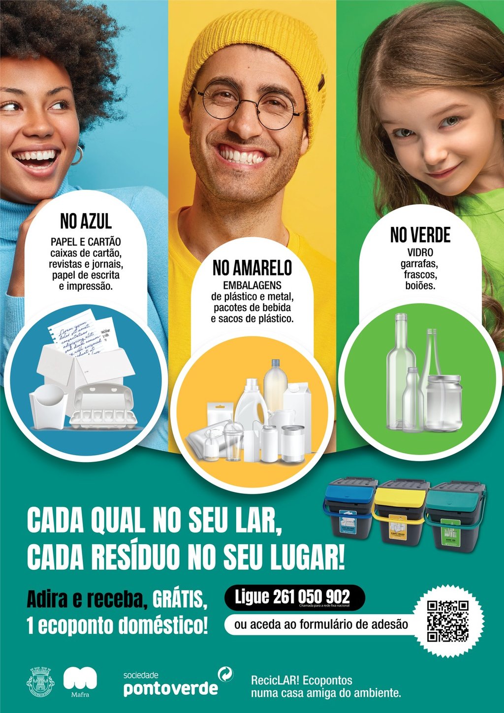 O Município de Mafra e a Sociedade Ponto Verde lançam uma nova operação de adesão à reciclagem doméstica, destinada a mobilizar as famílias do Concelho de Mafra (que não fazem reciclagem) para a triagem e valorização de resíduos. Adira a esta campanha e receba, grátis, um ecoponto doméstico para os três fluxos principais (embalagens de vidro, de plástico/ metal e de papel/ cartão).