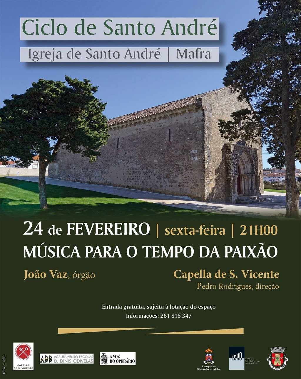 A Igreja de Santo André, em Mafra, acolhe a nova temporada do Ciclo de Música de Santo André. O primeiro concerto realiza-se já no próximo dia 24 de fevereiro, às 21h00, sendo protagonizado por João Vaz (órgão) e Duncan Fox (violone), acompanhados das vozes do coro da Capella de S. Vicente, sob a direção de Pedro Rodrigues.