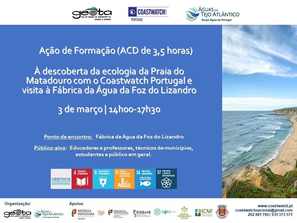 O Município de Mafra divulga a ação de formação de curta duração “À descoberta da ecologia da Praia do Matadouro com o Coastwatch Portugal e visita à Fábrica de Água da Foz do Lizandro”, a decorrer no dia 3 de março, entre as 14h00 e as 17h30, com início junto à referida Fábrica da Água.