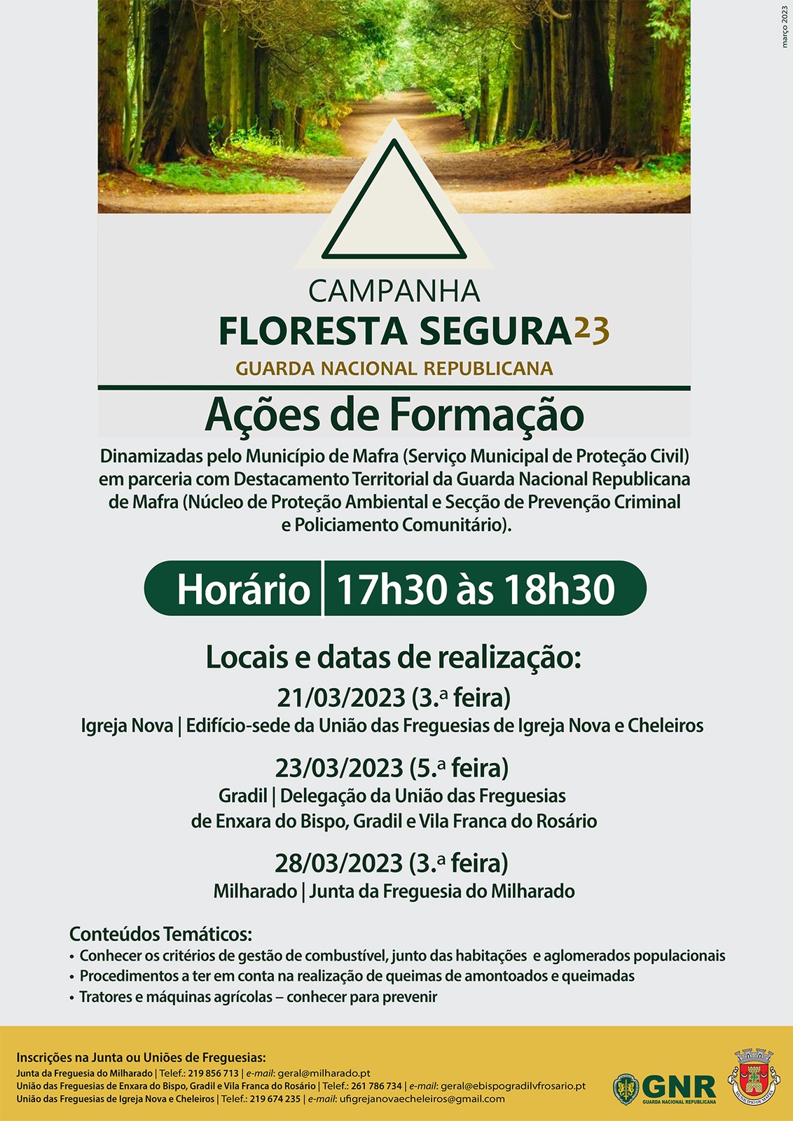 Inseridas na Campanha “Floresta Segura 2023”, a Guarda Nacional Republicana (GNR), através do Destacamento Territorial da GNR de Mafra, com a colaboração do Serviço Municipal de Proteção Civil, promove a realização de ações de formação. As sessões realizam-se nos dias 21, 23 e 28 de março, das 17h30 às 18h30, nas localidades de Igreja Nova, Vila Franca do Rosário e Milharado.