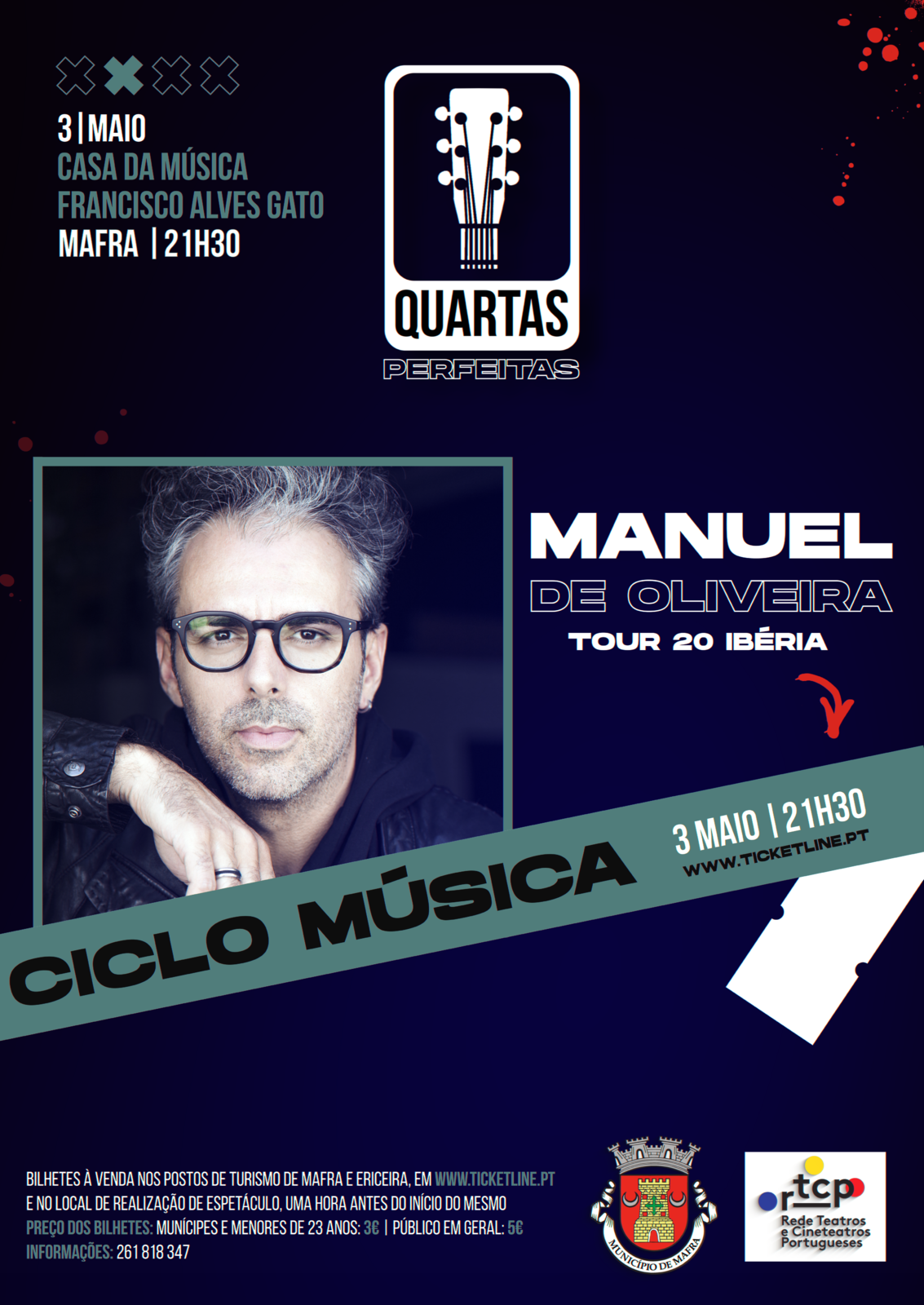 No próximo dia 3 de maio, às 21h30, o Ciclo de Música “Quartas Perfeitas” regressa à Casa da Música Francisco Alves Gato, em Mafra, para mais um concerto especial. O espetáculo “Tour 20 Ibéria” é protagonizado por Manuel de Oliveira, acompanhado dos músicos João Frade e Sandra Martins.