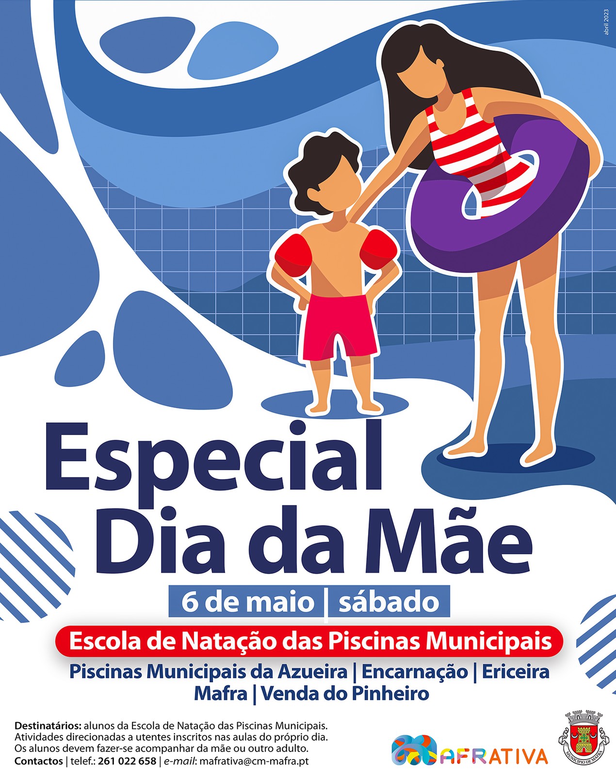 Para assinalar o Dia da Mãe, a Câmara Municipal de Mafra dinamiza um programa especial de atividades, no dia 6 de maio, nas instalações das Piscinas Municipais da Azueira, Encarnação, Ericeira, Mafra e Venda do Pinheiro.