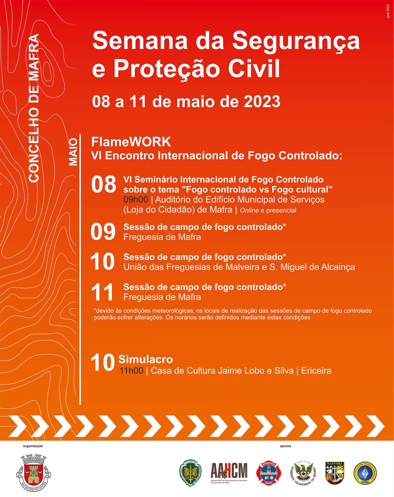 O Serviço Municipal de Proteção Civil informa que, no âmbito do programa da Semana da Segurança e Proteção Civil, se encontram a decorrer sessões de campo de fogo controlado, na Freguesia de Mafra e na União das Freguesias de Malveira e S. Miguel de Alcainça, nos dias 9, 10 e 11 de maio.