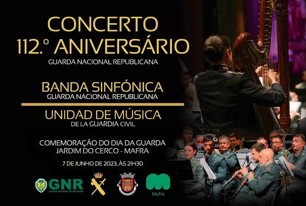 Tendo como cenário o Jardim do Cerco, em Mafra, a Guarda Nacional Republicana (GNR) comemora o seu 112.º aniversário com um concerto, no dia 7 de junho, às 21h30. O espetáculo tem o apoio do Município de Mafra. Entrada livre.
