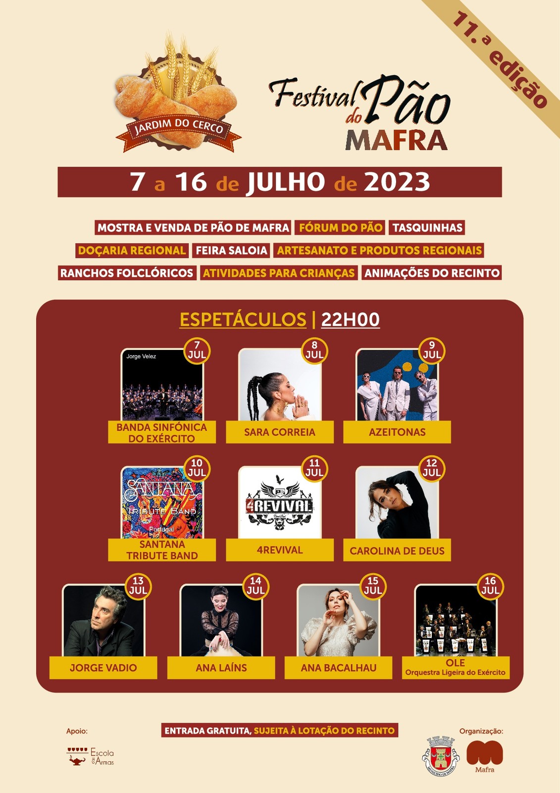 De 7 a 16 de julho, o Festival do Pão regressa ao Jardim do Cerco, em Mafra, com novidades: uma nova configuração do recinto, com maior destaque para as tradições locais; um programa diário e diferenciado do Fórum do Pão; e a participação da Região Autónoma dos Açores, como convidada especial.