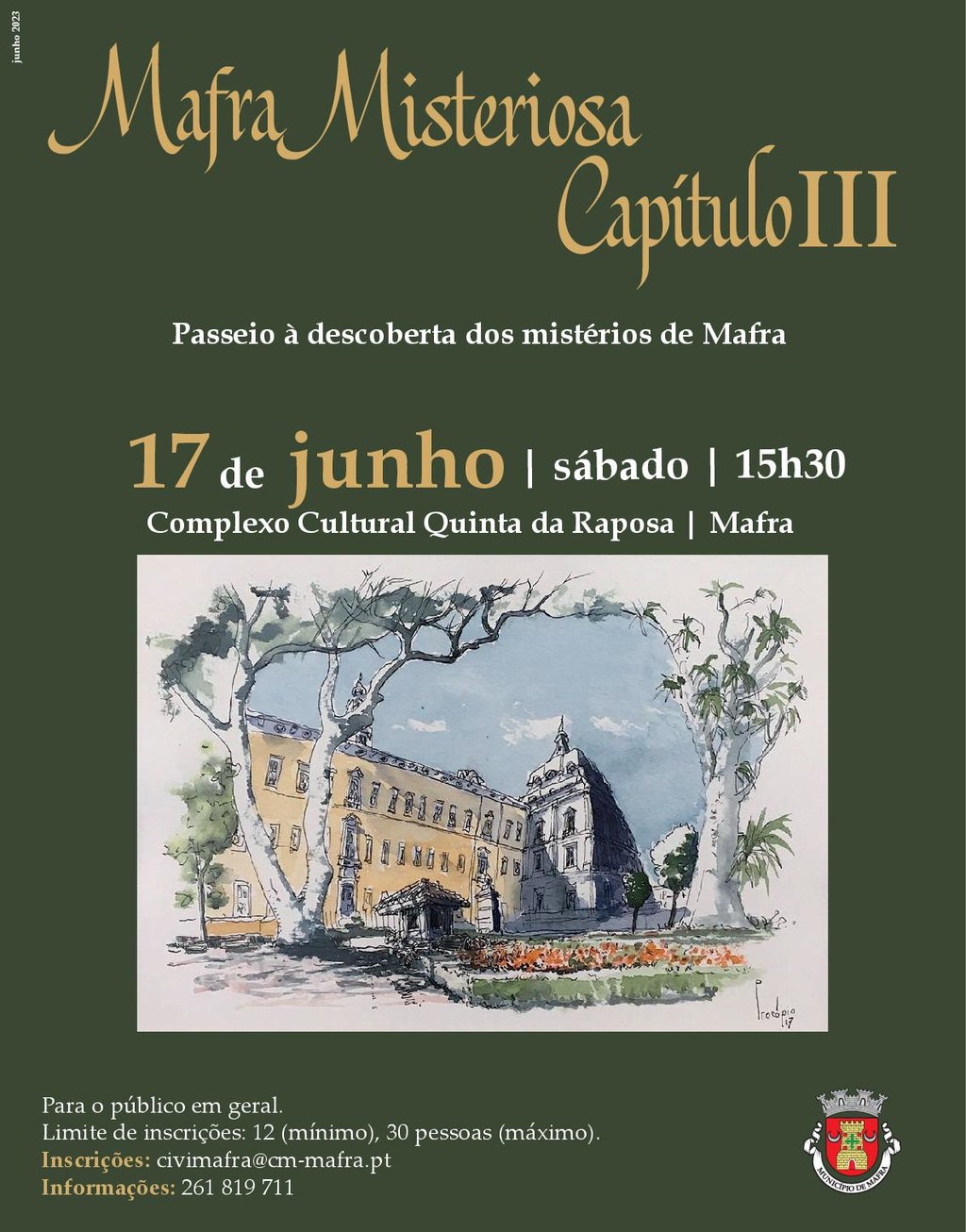 Conhece as histórias e lendas da Freguesia de Mafra? Participe na próxima iniciativa “Mafra Misteriosa” e descubra alguns dos mistérios e realidades de caráter metafísico que marcaram a vila e deram origem às tradições que se mantêm nos dias de hoje. O passeio realiza-se no dia 17 de junho, às 15h30, com início no Complexo Cultural Quinta da Raposa, em Mafra.