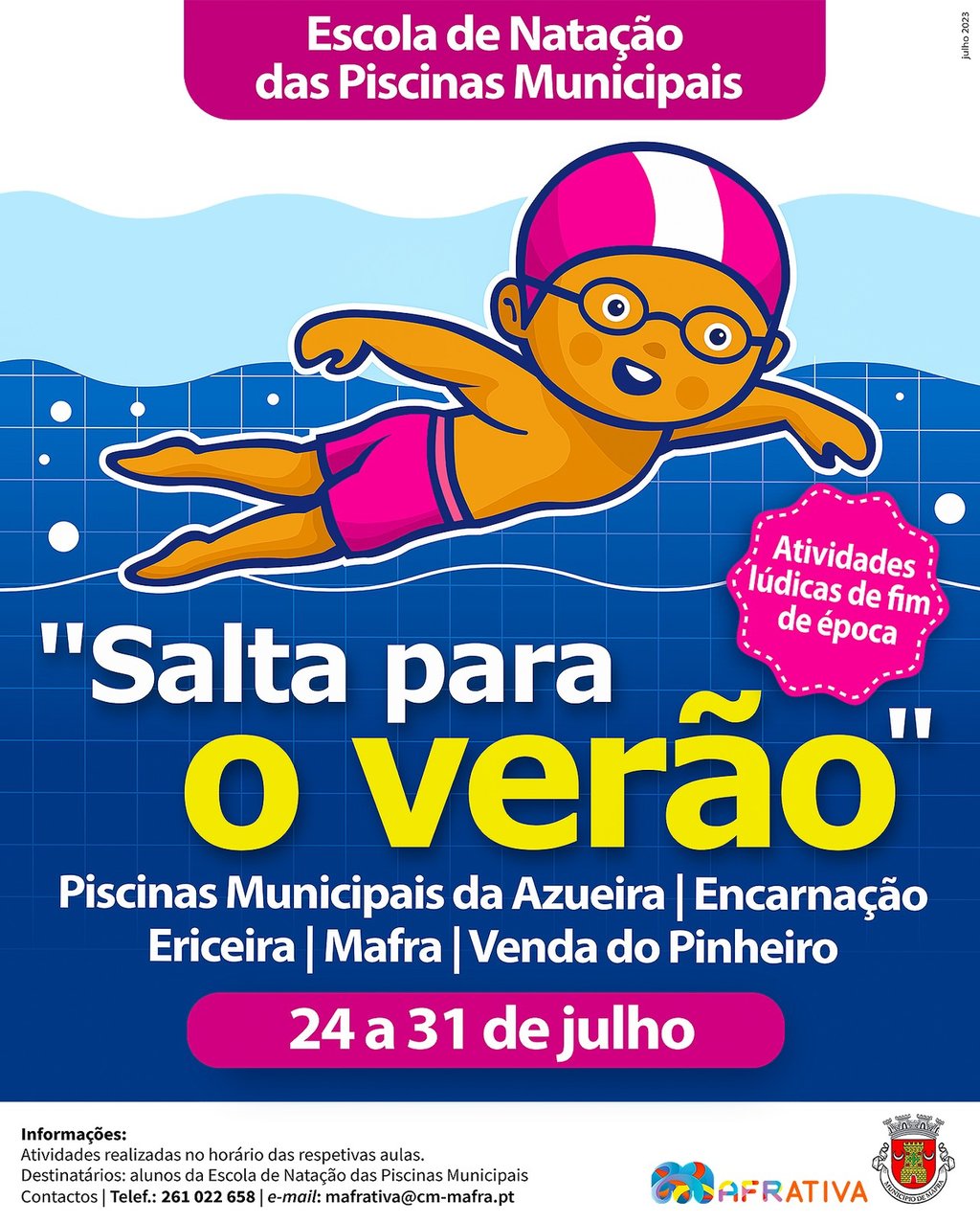 De 24 a 31 de julho, participa no programa de atividades lúdicas de fim de época, nas Piscinas Municipais da Azueira, Encarnação, Ericeira, Mafra e Venda do Pinheiro. “Salta para o verão” inclui a realização jogos e exercícios práticos, que promovam saltos para a água, durante o horário das aulas da Escola de Natação.