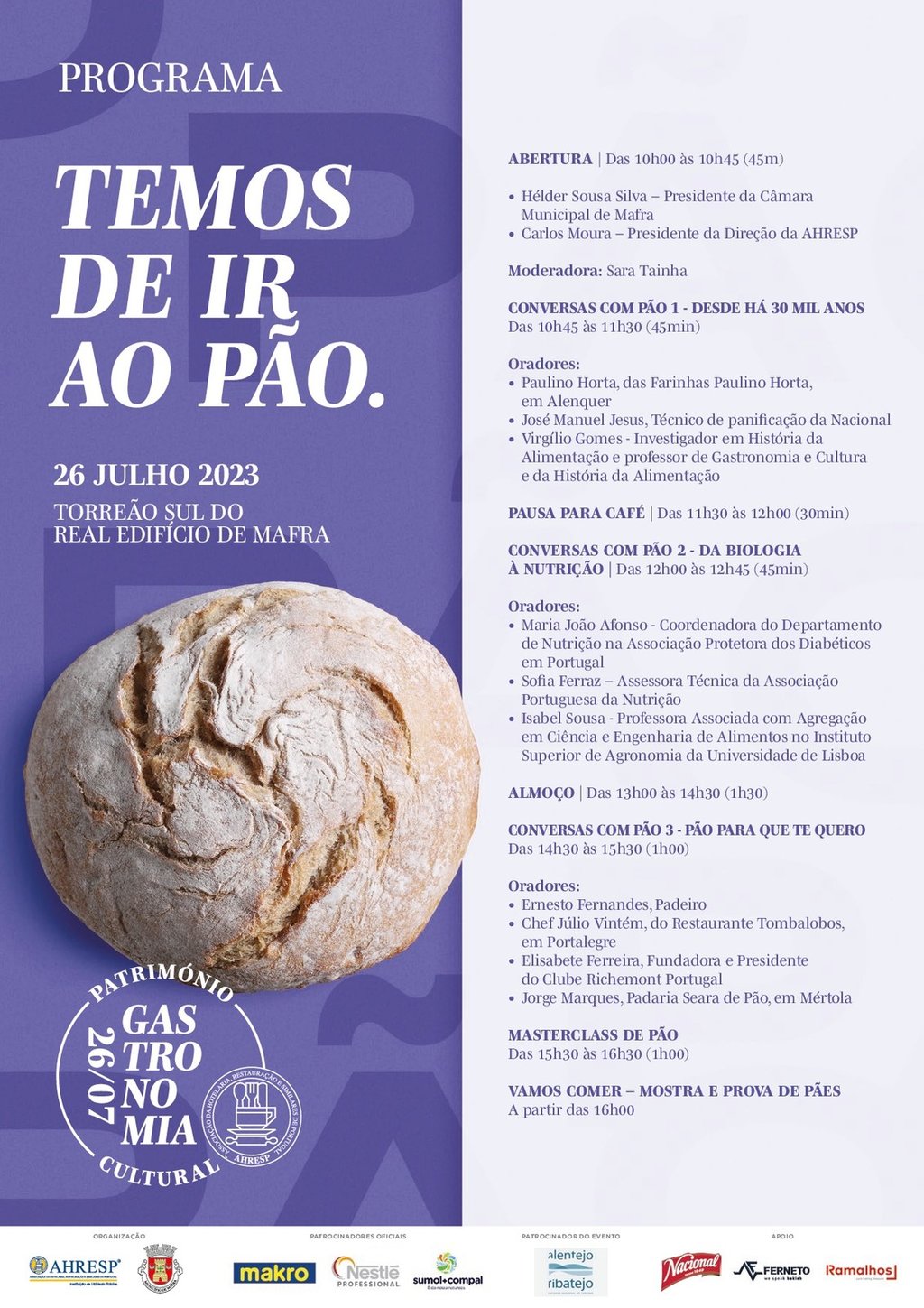 O Torreão Sul do Palácio Nacional de Mafra recebe, amanhã, dia 26 de julho, a partir das 10h00, a primeira edição do evento “Temos de ir ao Pão”. O programa assinala o “Dia da Gastronomia – Património Cultural”, integrando mesas-redondas com convidados de diversas áreas, uma masterclass de pão, mostras e provas de pães de várias regiões do país.