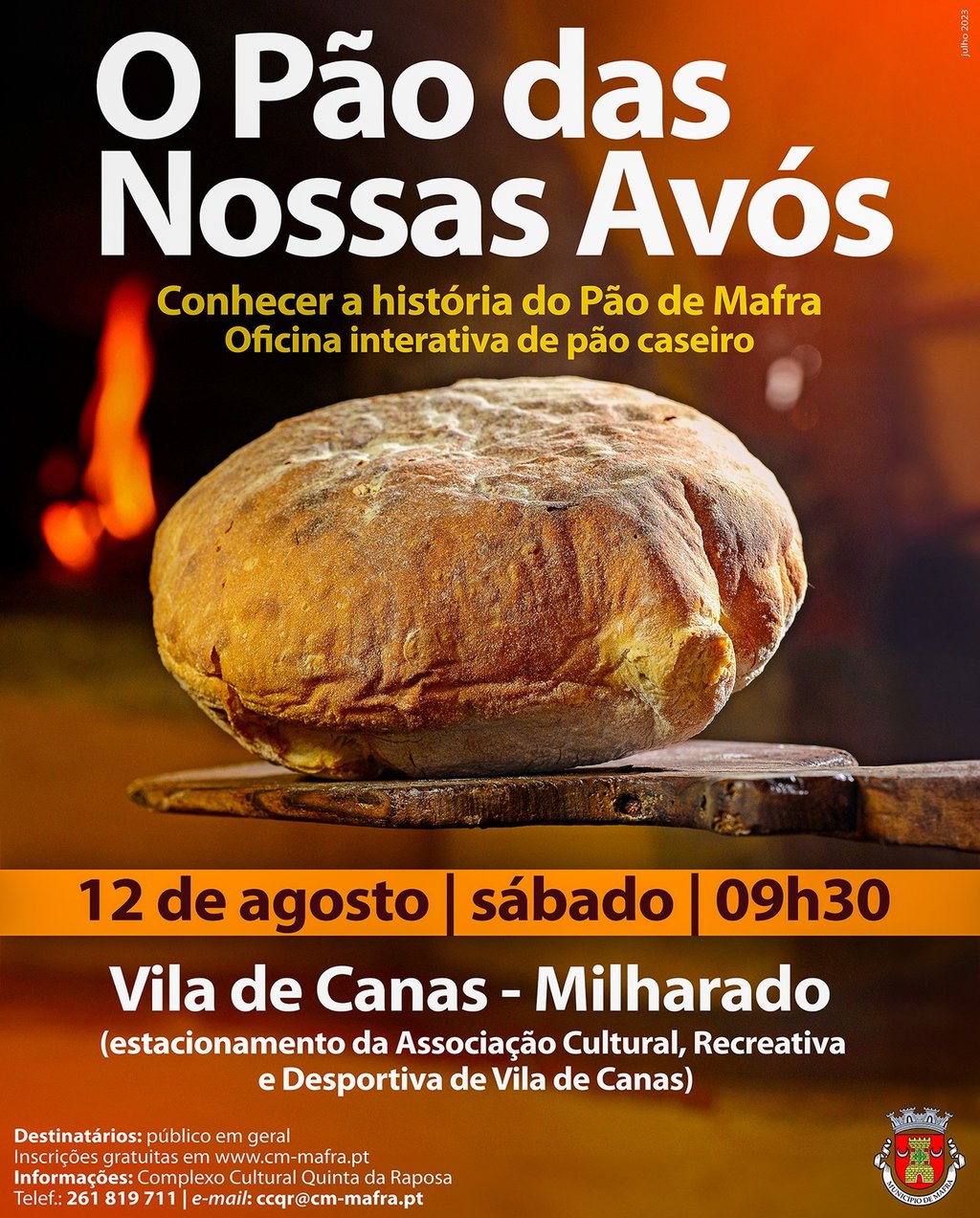 A localidade de Vila de Canas (Freguesia do Milharado) volta a receber uma atividade especial do “Pão das Nossas Avós”, no dia 12 de agosto, às 09h30. Esta iniciativa dá a conhecer o património gastronómico e etnográfico, através da visita a um moinho, seguida de uma oficina de fabrico de pão caseiro, orientada por um grupo de residentes da comunidade local.