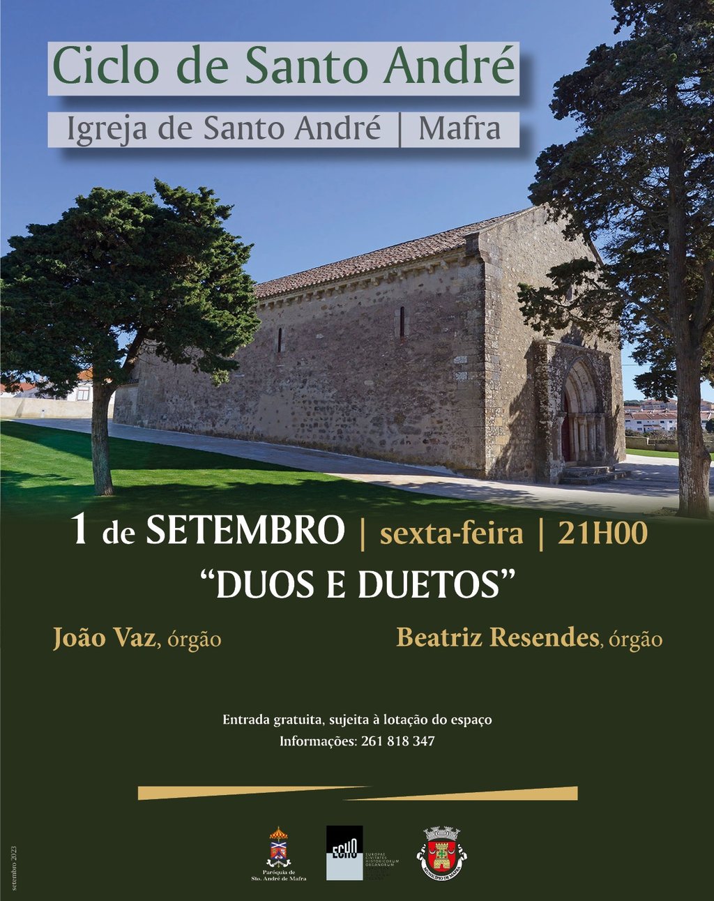 O Ciclo de Música de Santo André regressa com mais um concerto de órgão, na Igreja de Santo André, em Mafra. O concerto decorre no dia 1 de setembro, às 21h00, sendo protagonizado pelos organistas João Vaz e Beatriz Resendes.