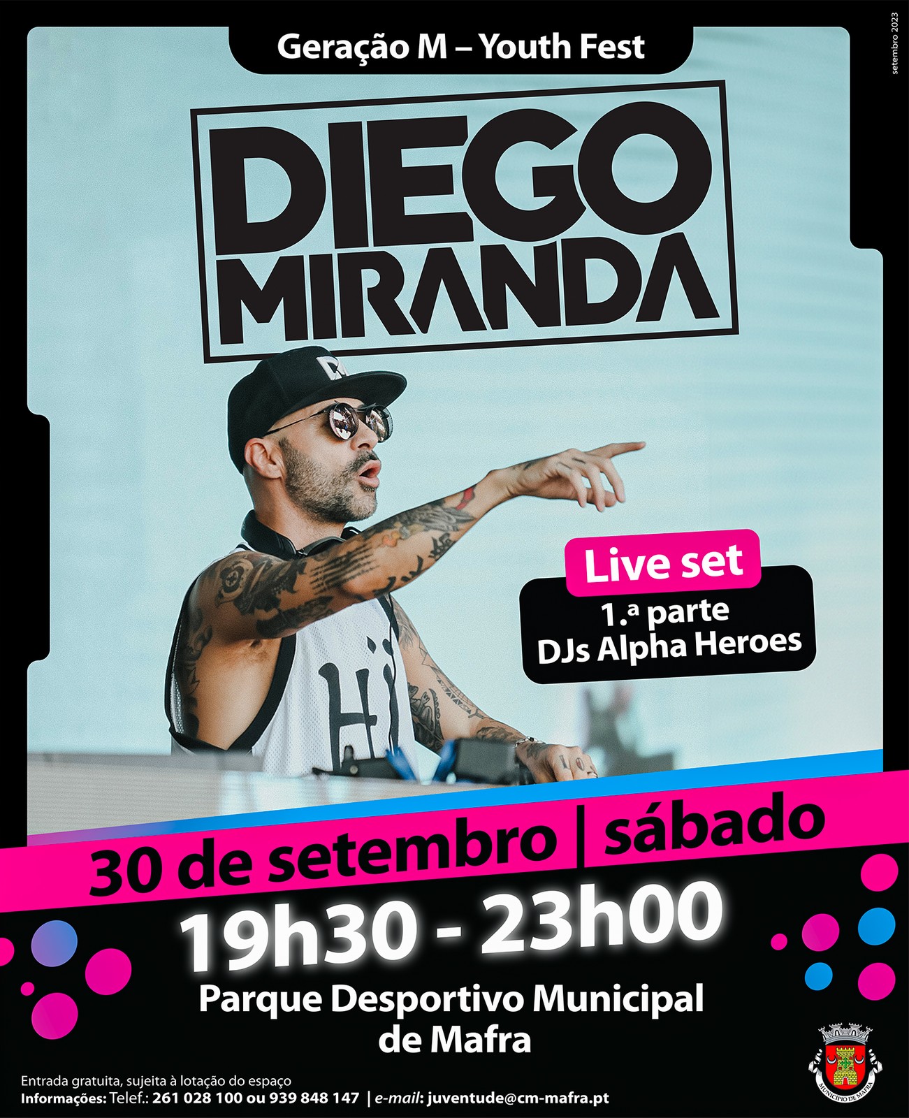 Queres entrar no novo ano letivo em festa? No próximo dia 30 de setembro, vem até ao Parque Desportivo Municipal de Mafra e junta-te ao Youth Fest “Geração M”, que tem como cabeça de cartaz o DJ Diego Miranda. O live set começa às 19h30, estando a primeira parte a cargo dos DJs Alpha Heroes, e prolonga-se até às 23h00.