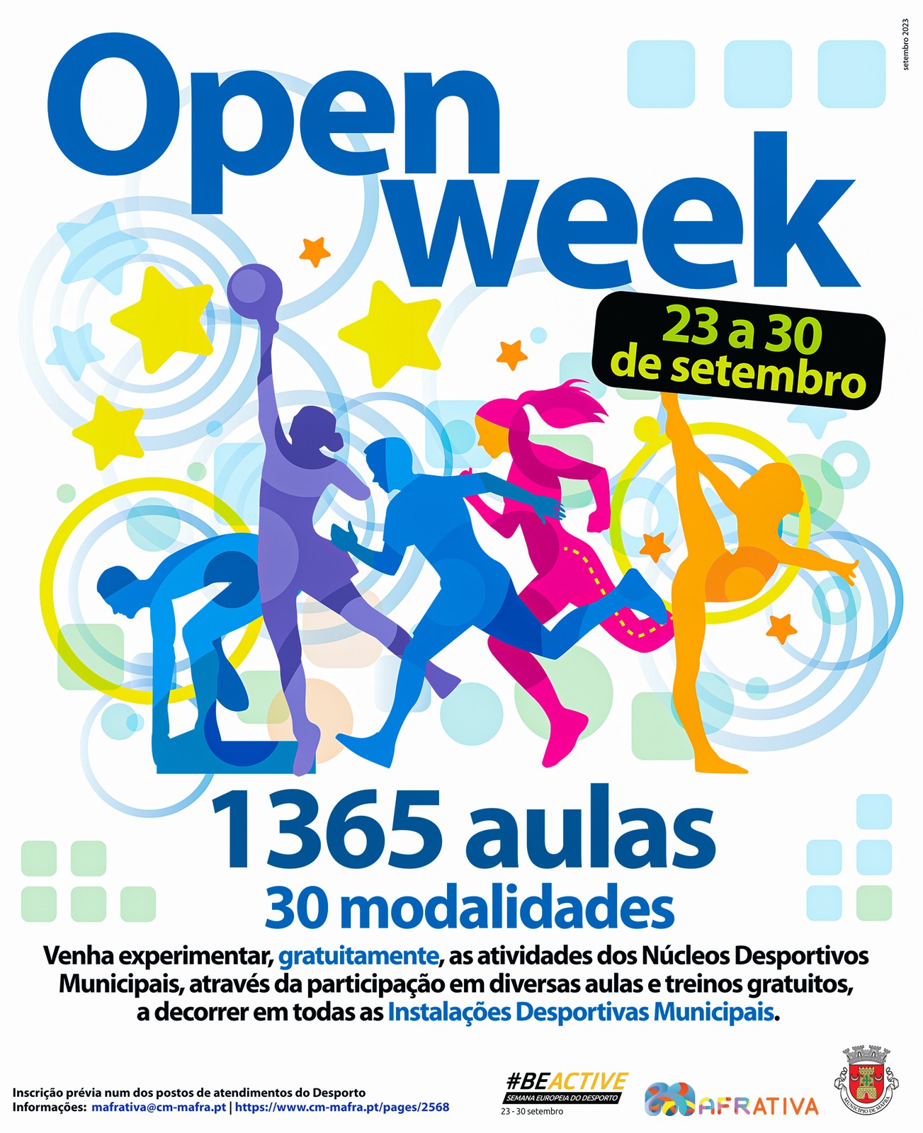 Venha experimentar as modalidades disponíveis nos núcleos desportivos municipais. A Câmara Municipal de Mafra promove a Open Week, associando-se à comemoração da Semana Europeia do Desporto. De 23 a 30 de setembro, são disponibilizadas, gratuitamente, 1365 aulas e 30 modalidades diferentes nas instalações desportivas municipais, dando a conhecer a diversidade da oferta proporcionada. Inscreva-se e participe!