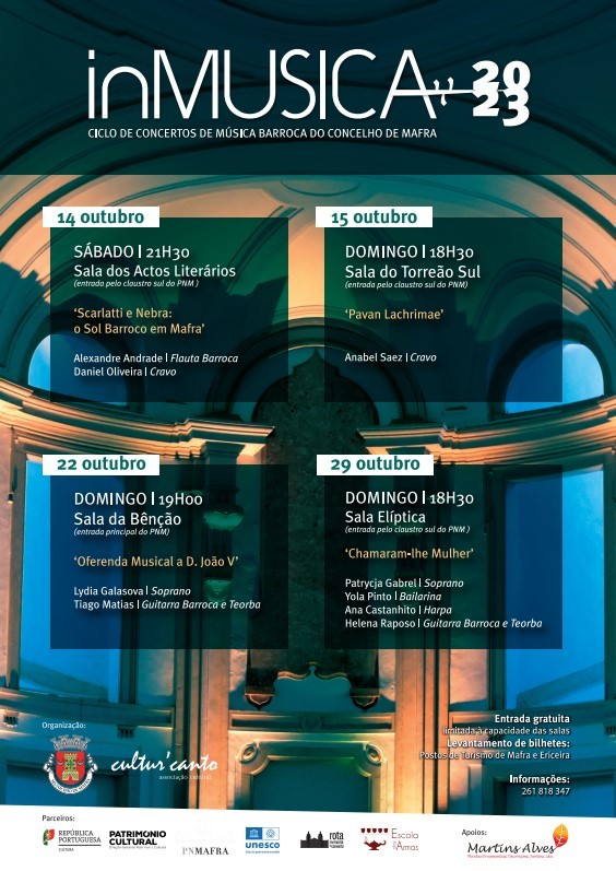 O inMusica – Ciclo de Música Barroca do Concelho de Mafra está quase a começar! De 14 a 29 de outubro, estão agendados quatro concertos, em algumas das mais emblemáticas salas do Real Edifício de Mafra.