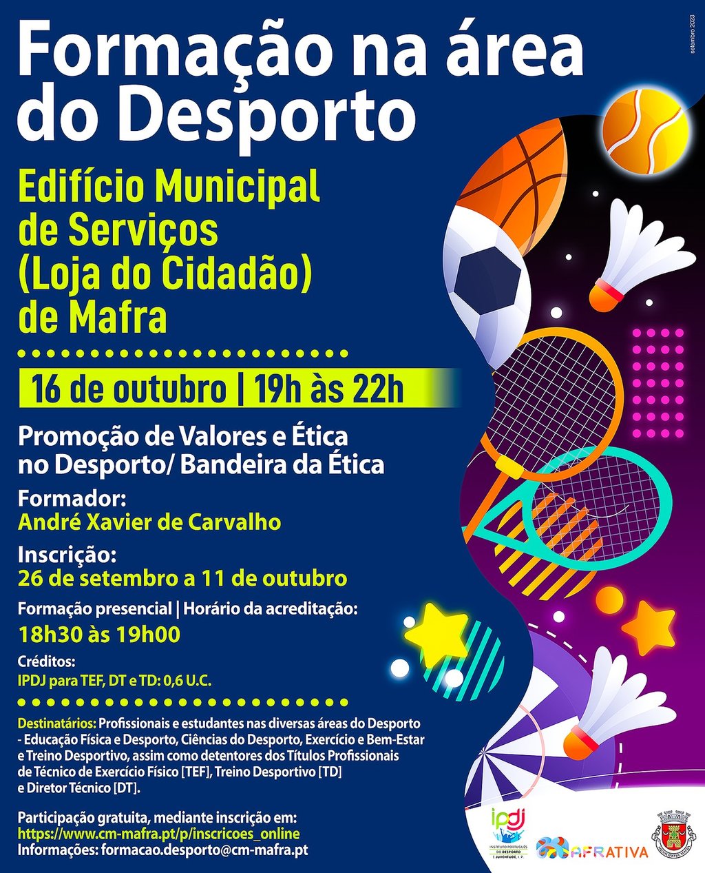 “Promoção de Valores e Ética no Desporto/ Bandeira da Ética” é o tema da próxima formação gratuita na área do desporto, dinamizada por André Xavier de Carvalho, no dia 16 de outubro, entre as 19h00 e as 22h00, no Edifício Municipal de Serviços (Loja do Cidadão) de Mafra.