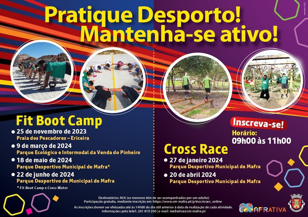 O programa de incentivo à prática de exercício físico ao ar livre está de volta. Com treinos desportivos gratuitos, realizados uma vez por mês, o Fit Boot Camp/ Cross Race estará a decorrer entre novembro de 2023 e junho de 2024 (exceto em dezembro e fevereiro), em vários locais do Concelho de Mafra.