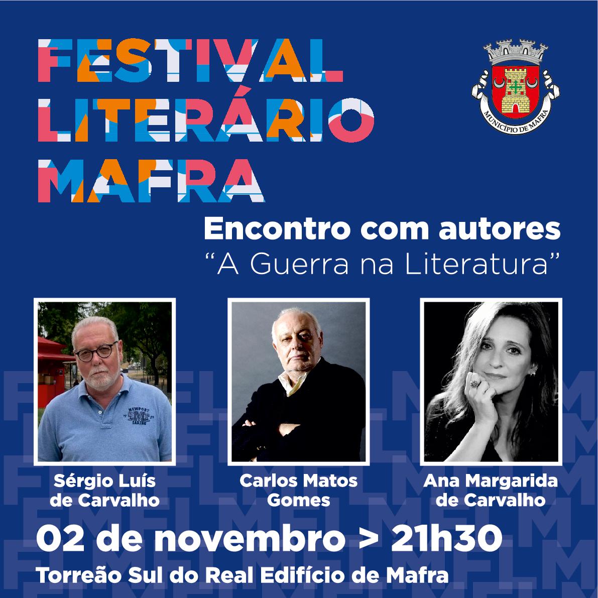 “A Guerra na Literatura” é o tema do segundo encontro com autores do Festival Literário de Mafra. Sérgio Luís de Carvalho, Carlos Matos Gomes e Ana Margarida de Carvalho vão estar presentes no dia 2 de novembro, às 21h30, no Torreão Sul do Real Edifício de Mafra.