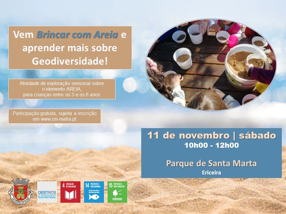 No dia 11 de novembro, pelas 10h00, traga as suas crianças ao Parque de Santa Marta (Ericeira) e venha divertir-se a explorar as várias texturas, cores, formas e cheiros. “Brincar com Areia” é o tema da atividade que dá a conhecer a geodiversidade das praias, num incentivo à criatividade e imaginação dos mais pequenos.