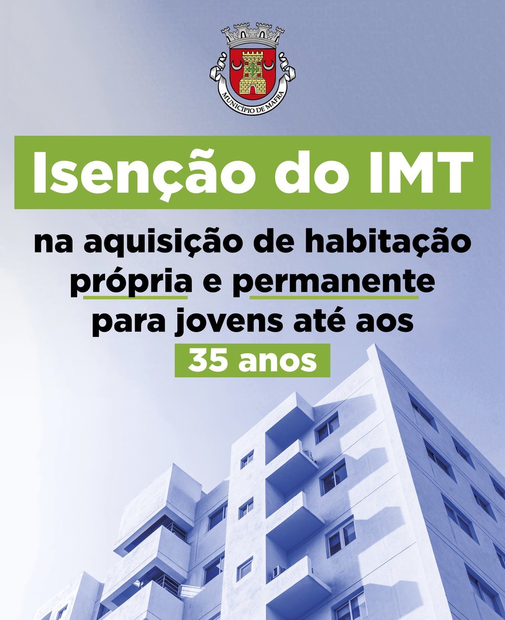 Entrou em vigor a isenção do Imposto Municipal sobre Transações Onerosas de Imóveis (IMT) para jovens até aos 35 anos na aquisição de habitação própria e permanente, até 250 mil euros, na sequência da alteração ao Regulamento de Benefícios Fiscais do Município de Mafra, publicada em “Diário da República”.