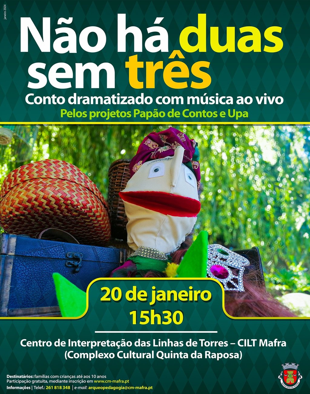 Sabia que as Invasões Francesas podem ser contadas de forma divertida? No dia 20 de janeiro, pelas 15h30, não perca o conto dramatizado com música ao vivo “Não há duas sem três”. A atividade realiza-se no Centro de Interpretação das Linhas de Torres – CILT Mafra, localizado no Complexo Cultural Quinta da Raposa, em Mafra.