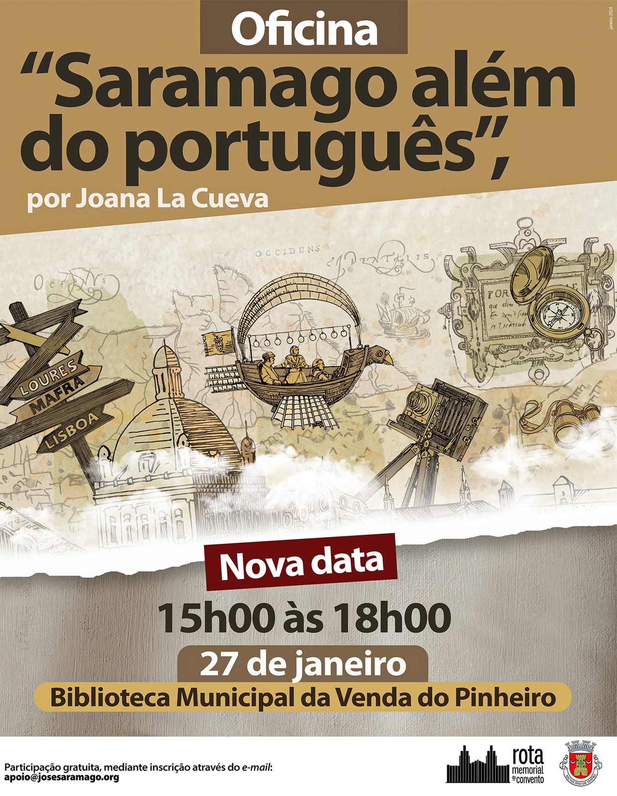 Venha explorar a visão de José Saramago e os grandes temas abordados pelo autor na obra “Memorial do Convento”, como literatura, cultura, direitos humanos ou cidadania. A oficina “Saramago Além do Português” volta a realizar-se já no próximo sábado, dia 27 de janeiro, às 15h00, na Biblioteca Municipal da Venda do Pinheiro.