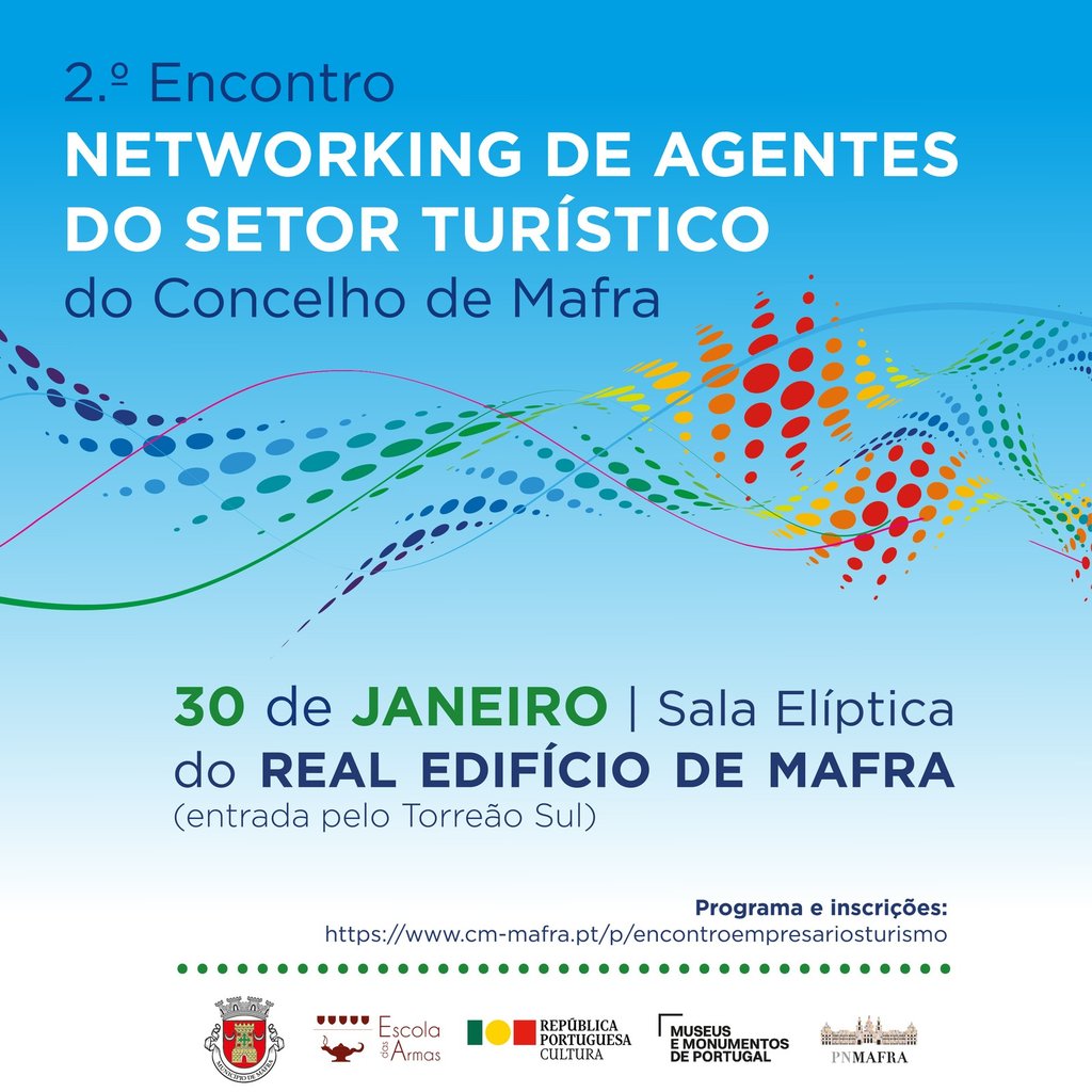 Atualização - lotação esgotada. O Município de Mafra organiza o 2.º Encontro de Networking de Agentes do Setor Turístico do Concelho de Mafra, no dia 30 de janeiro, na Sala Elíptica do Real Edifício de Mafra, gentilmente cedida pela Escola das Armas (entrada pelo Torreão Sul).