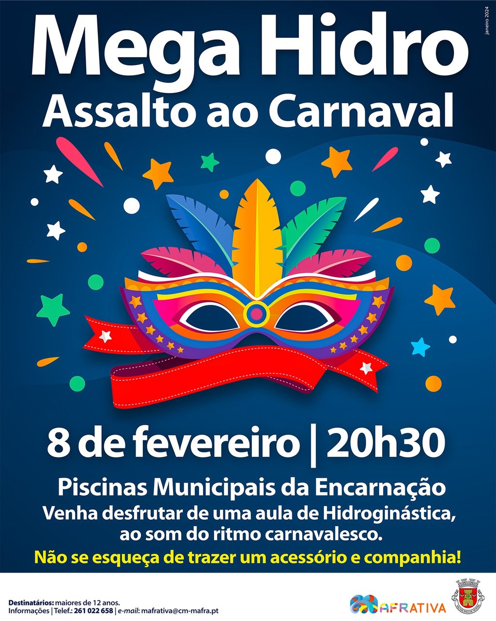 Venha desfrutar, gratuitamente, de uma aula de hidroginástica, ao som de algumas das melhores músicas do ritmo carnavalesco. A Mega Hidro “Assalto ao Carnaval” realiza-se no dia 8 de fevereiro, pelas 20h30, nas Piscinas Municipais da Encarnação.