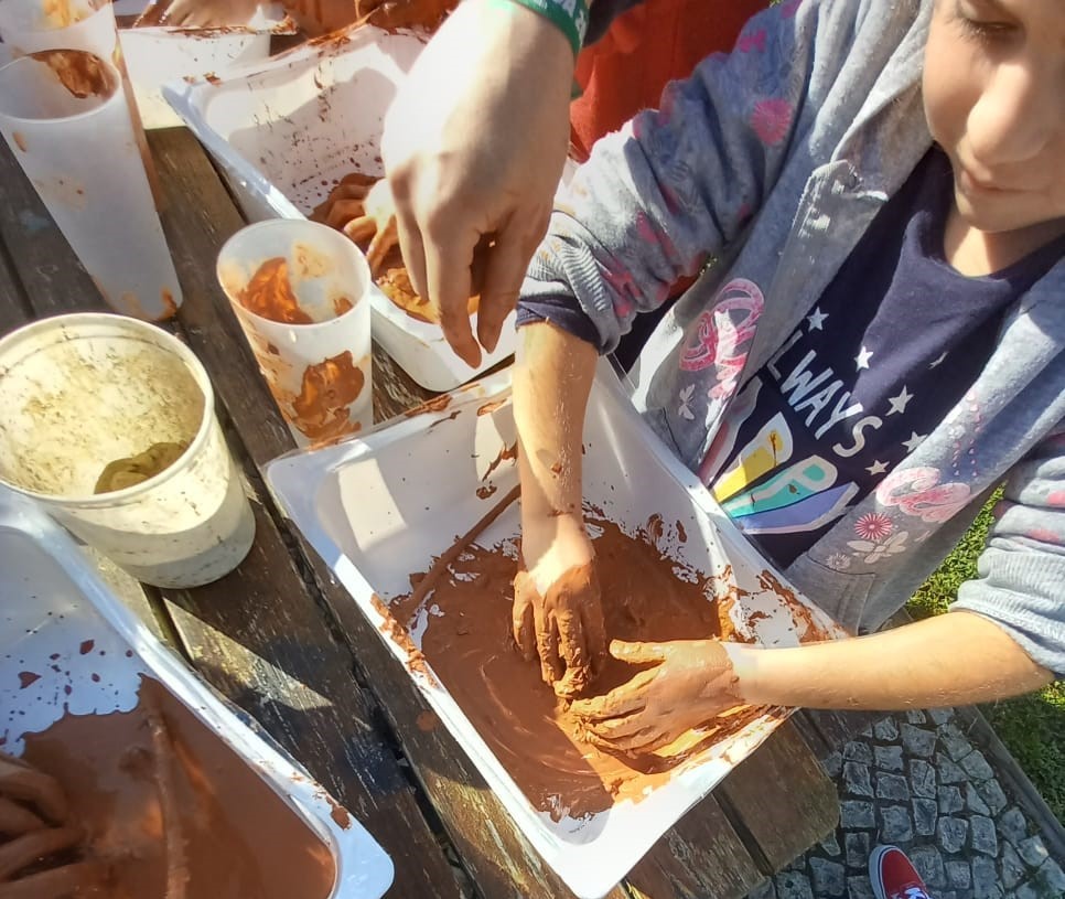 Transformar lama em tinta, dando asas à imaginação. O workshop “Brincar com a lama” juntou os mais pequenos numa atividade que explorou texturas, cores, formas e cheiros, criando verdadeiras “obras de arte”, com recurso a papel, pincéis e carimbos naturais.