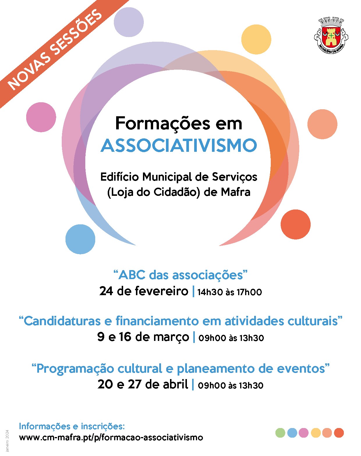 Considerando a afluência registada no Ciclo de Formações em Associativismo, a Câmara Municipal dinamiza novas sessões, nos mesmos temas, destinadas a todos os agentes e representantes das associações do Concelho de Mafra.