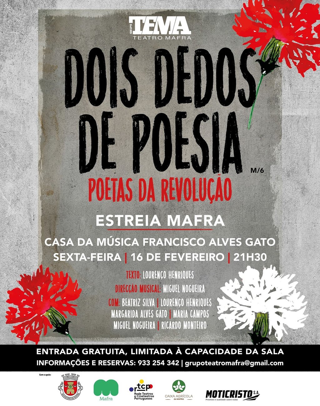 Entrada gratuita, limitada à capacidade da sala. As reservas de bilhetes devem ser efetuadas através do telemóvel 933 254 342, ou para o e-mail: grupoteatromafra@gmail.com