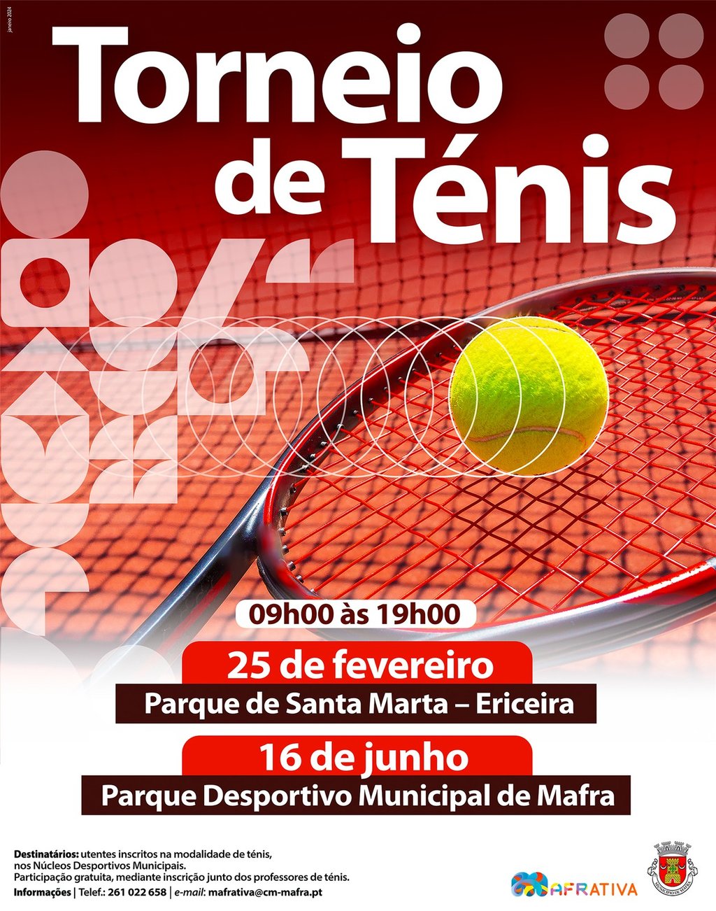 Se gosta de conviver e é utente da modalidade de ténis nos Núcleos Desportivos Municipais, participe no torneio do dia 25 de fevereiro, no Parque de Santa Marta, na Ericeira! Entre as 09h00 e as 19h00, venha fazer parte desta competição, organizada pelos professores da modalidade.