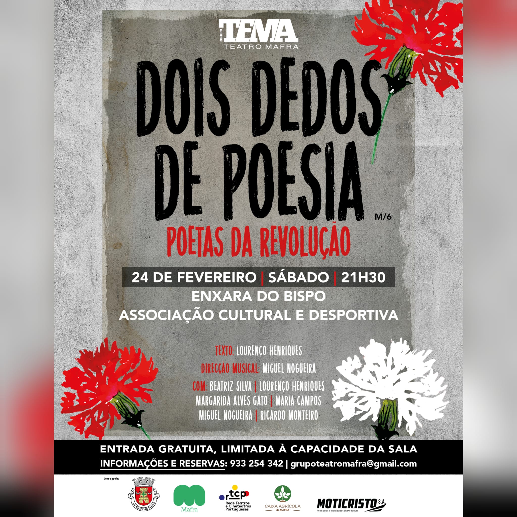 O Grupo TEMA – Teatro Mafra continua a percorrer as salas de espetáculo do concelho com a nova temporada da tertúlia “Dois Dedos de Poesia”. Sob o tema “Poetas da Revolução”, o grupo leva a história, a música e a poesia da Revolução dos Cravos à Associação Cultural e Desportiva da Enxara do Bispo, no próximo dia 24 de fevereiro, às 21h30.