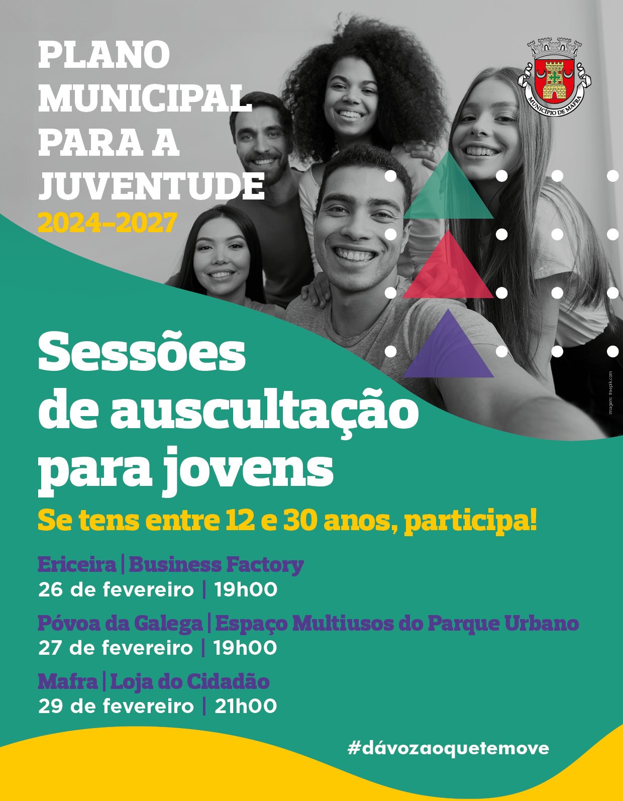 Dá voz ao que te move! O Município de Mafra encontra-se a elaborar o Plano Municipal para a Juventude de Mafra 2024-2027 e precisa do teu contributo. Se tens entre 12 e 30 anos, inscreve-te numa das sessões de auscultação e partilha as tuas expectativas, visões e reflexões sobre o presente e o futuro do concelho.