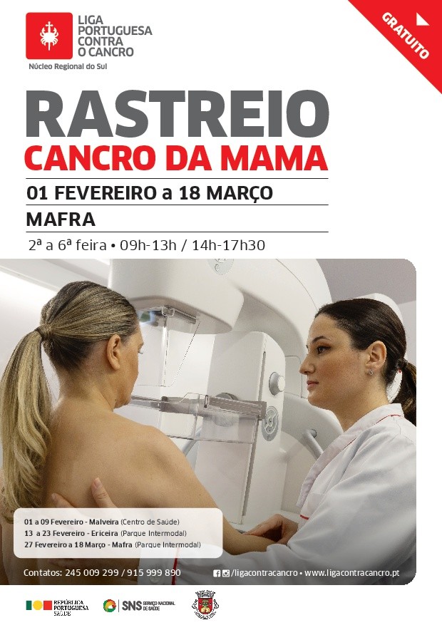 As ações de rastreio gratuito do cancro da mama, para mulheres dos 50 aos 69 anos, continuam. A última ação será em Mafra (Parque Intermodal, junto às escolas), de 27 de fevereiro a 18 de março (dias úteis), das 09h00 às 13h00 e das 14h00 às 17h30.