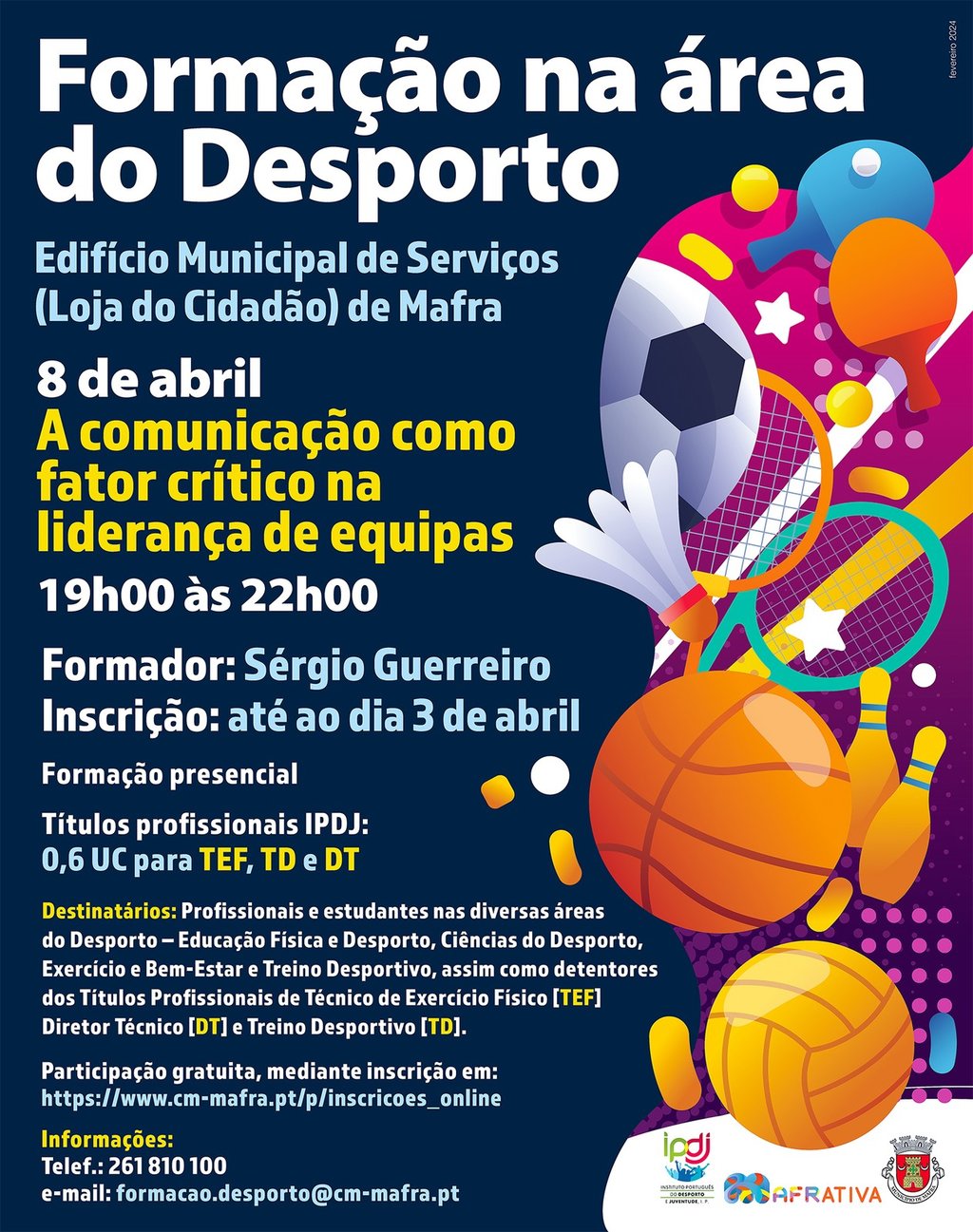 A Câmara Municipal de Mafra e o Instituto Português do Desporto e Juventude (IPDJ) promovem novas ações de formação gratuitas na área do desporto. A próxima sessão, sob o tema “A comunicação como fator crítico na liderança de equipas”, pelo formador Sérgio Guerreiro, realiza-se no dia 8 de abril, entre as 19h00 e as 22h00, no Edifício Municipal de Serviços (Loja do Cidadão) de Mafra.