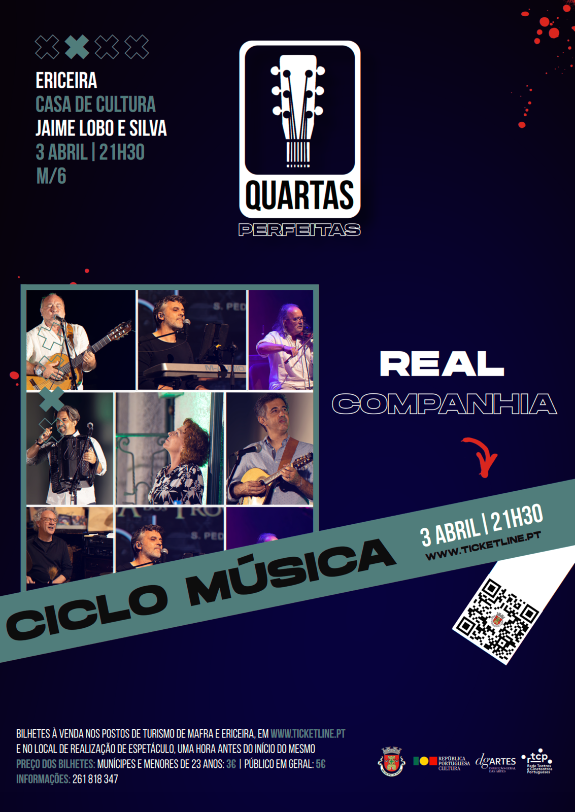 Com 27 anos de carreira e um legado associado ao Folk e à música popular portuguesa, o grupo musical Real Companhia é o protagonista do próximo concerto do Ciclo de Música “Quartas Perfeitas”. Não perca o concerto, no dia 3 de abril, às 21h30, na Casa de Cultura Jaime Lobo e Silva (Ericeira).