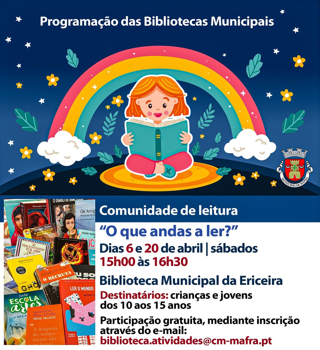 Tens entre 10 e 15 anos e a leitura faz parte dos teus tempos livres? Participa na iniciativa “O que andas a ler?” e fala-nos mais sobre o teu livro preferido. A comunidade de leitura volta a estar reunida nos dias 6 e 20 de abril, às 15h00, na Biblioteca Municipal da Ericeira.