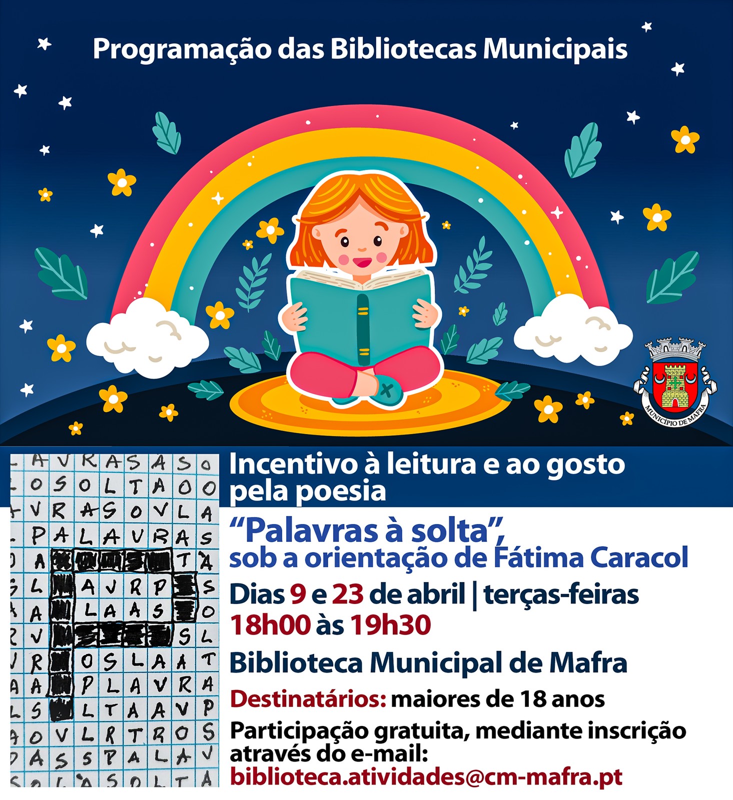 A Biblioteca Municipal de Mafra volta a receber sessões de leitura, num incentivo ao gosto pela poesia. A oficina “Palavras à solta”, orientada por Fátima Caracol, realiza-se nos dias 9 e 23 de abril, das 18h00 às 19h30.