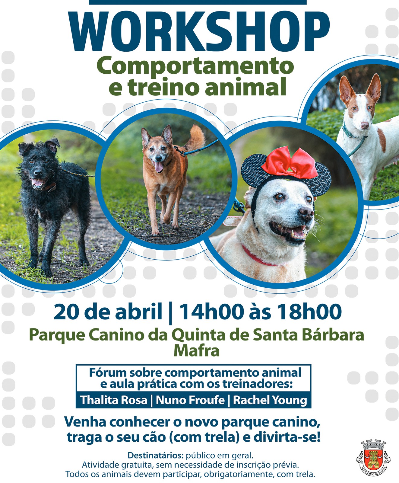 Sabia que o jardim da Quinta de Santa Bárbara, em Mafra, tem um novo parque canino? No dia 20 de abril, entre as 14h00 e as 18h00, traga o seu cão (com trela) e venha participar no workshop de comportamento e treino animal, com uma aula prática dinamizada por três treinadores experientes.