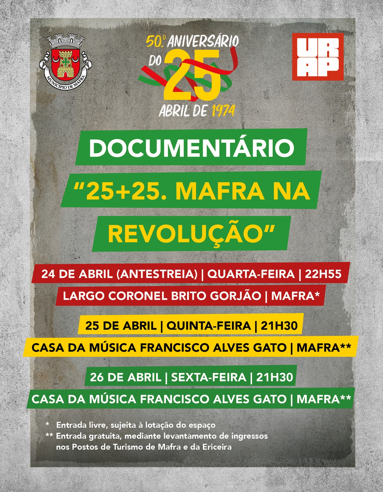 No âmbito do programa de atividades culturais de comemoração do 50.º aniversário do 25 de Abril de 1974 no Concelho de Mafra, a Câmara Municipal apresenta o documentário “25+25. Mafra na Revolução”, cuja antestreia está marcada para as 22h55 do dia 24 de abril de 2024, no Largo Coronel Brito Gorjão, em Mafra. Entrada livre, sujeita à lotação do espaço.
