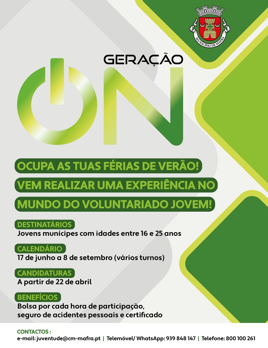 Ocupa as tuas férias de verão! Vem realizar uma experiência no mundo do voluntariado jovem! Se tens entre 16 e 25 anos e resides no Concelho de Mafra, o projeto Geração ON Verão é a proposta ideal para ti. As candidaturas já estão abertas. Inscreve-te!