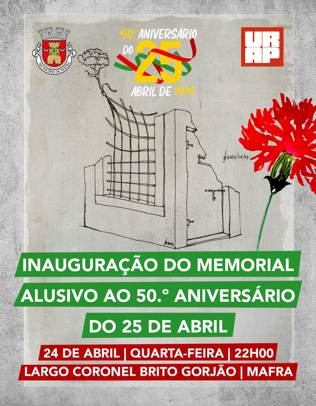 No âmbito das comemorações do cinquentenário do 25 de Abril de 1974, a Câmara Municipal de Mafra e a URAP – União de Resistentes Antifascistas Portugueses inauguram o memorial alusivo a esta efeméride, no dia 24 de abril de 2024, às 22h00, no Largo Coronel Brito Gorjão, em Mafra.