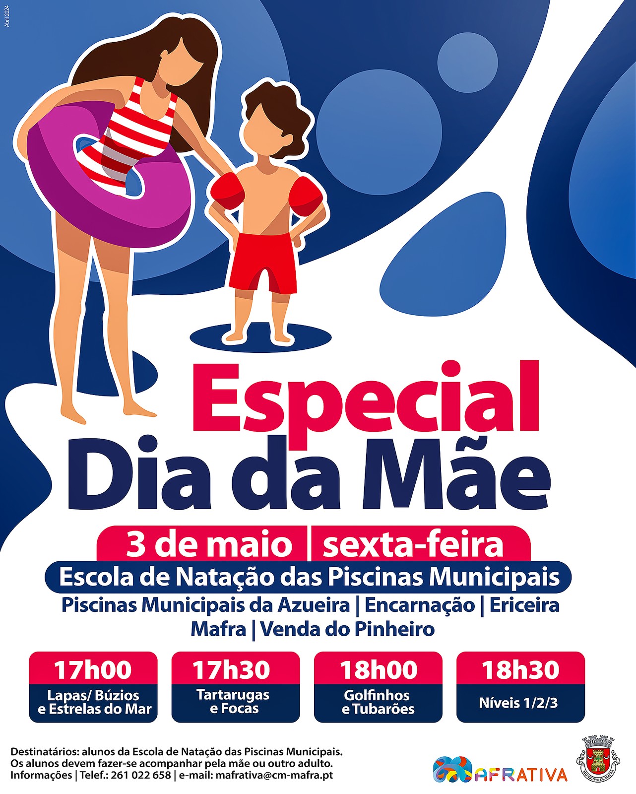 Venha celebrar o Dia da Mãe na Escola de Natação das Piscinas Municipais! No dia 3 de maio, os alunos das classes Lapas/Búzios e Estrelas do Mar (17h00), Tartarugas e Focas (17h30), Golfinhos e Tubarões (18h00), bem como os níveis 1, 2 e 3 (18h30), podem fazer-se acompanhar pela mãe ou outro adulto.