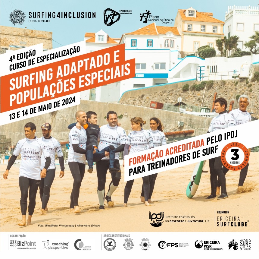 Com vista à capacitação dos profissionais de ensino de Surfing, estará a decorrer a 4.ª edição do curso de especialização “Surfing Adaptado e Populações Especiais”, nos dias 13 e 14 de maio. Esta formação divide-se em sessões teóricas, a terem lugar nas instalações da Ericeira Business Factory, e sessões práticas, em praia a definir.