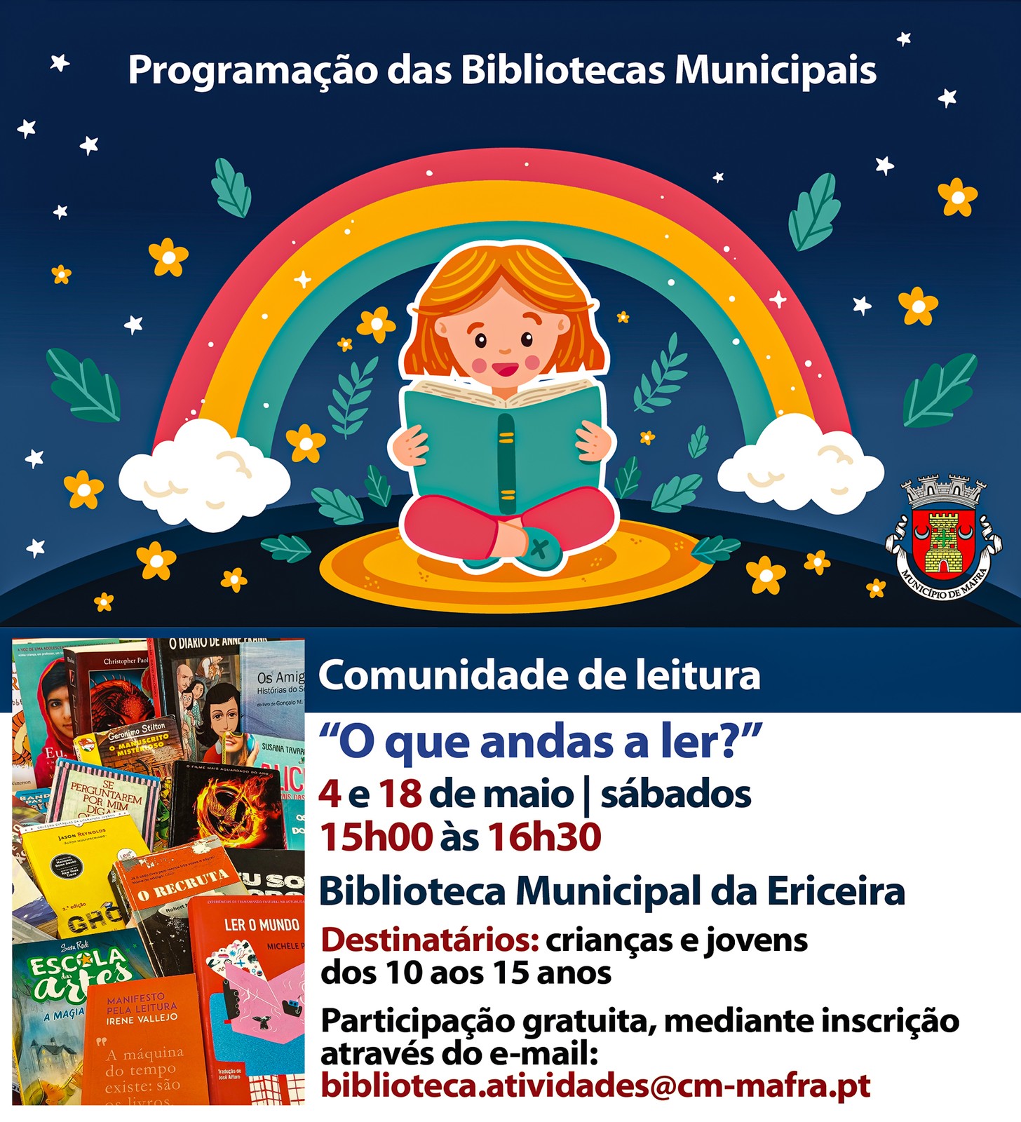 Tens entre 10 e 15 anos e gostas de explorar o mundo dos livros? Junta-te à comunidade de leitura “O que andas a ler?” e conta-nos qual é o teu livro preferido. Junta-te a nós, nos dias 4 e 18 de maio, às 15h00, na Biblioteca Municipal da Ericeira! E não te esqueças de trazer um livro contigo!